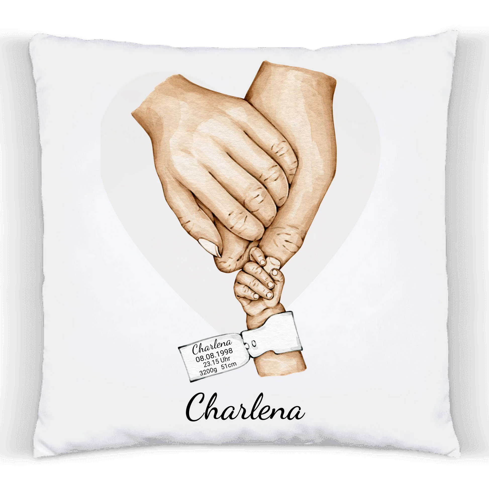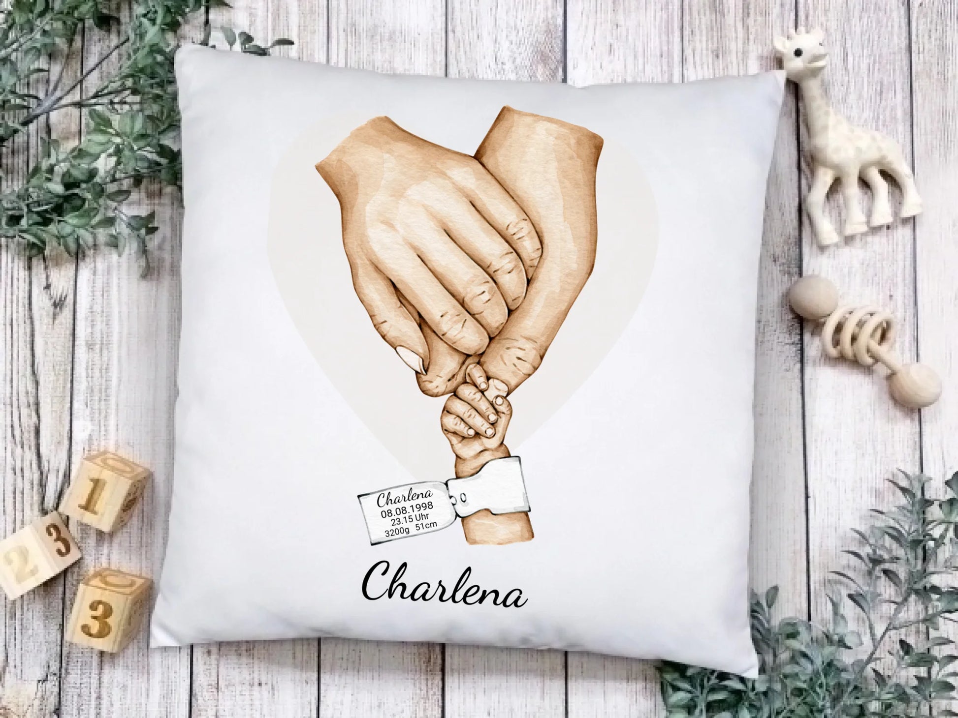 Geburtsgeschenk & Taufgeschenk Babygeschenk Kissen personalisiert zur Geburt & Taufe mit Namen und Geburtsdaten | Hände Motiv