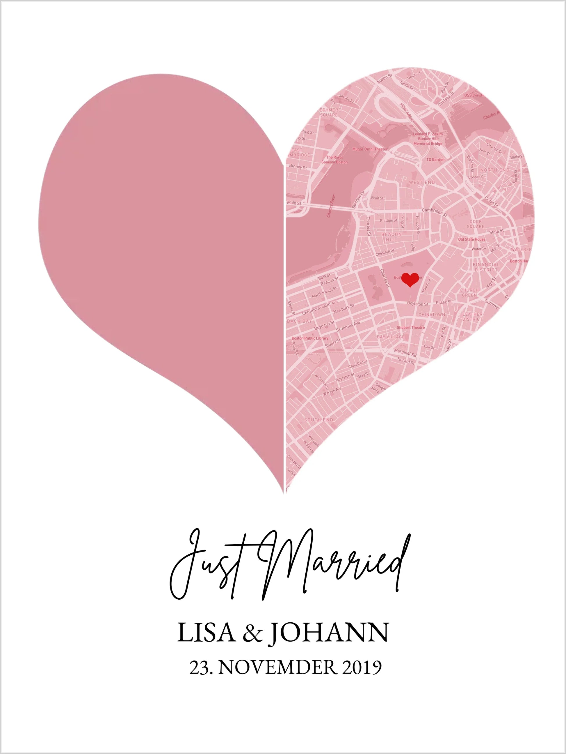Just Married Hochzeitsposter Herz Geschenk personalisiert | Geschenk zur Hochzeit mit Foto | Fotoposer Stadtkarte Bild