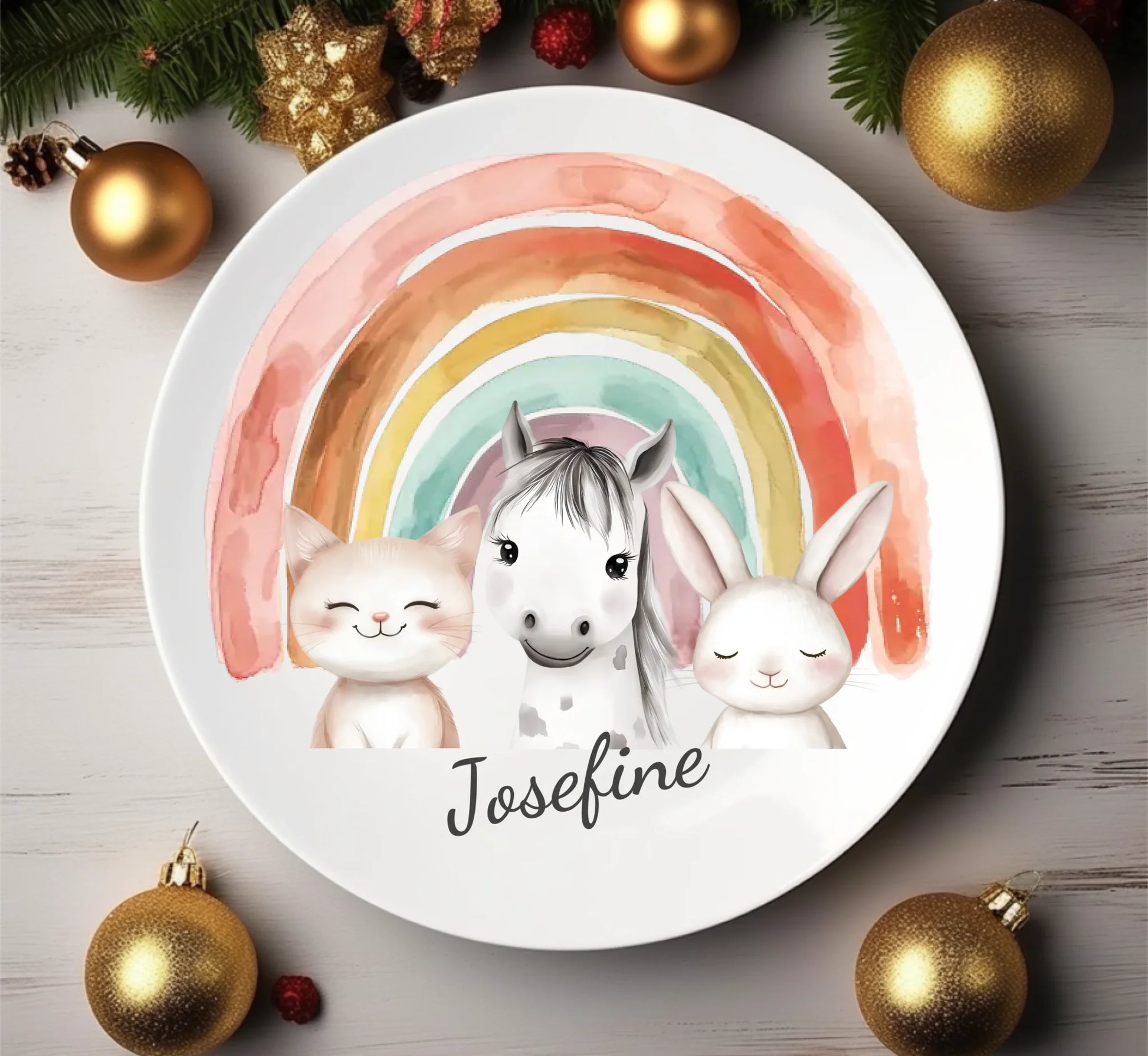 Kinderteller Regenbogen mit Namen & Farmtieren personalisiert, Kindergeschirr Geschenk zur Taufe, Geburt, Geburtstag und Weihnachten 2
