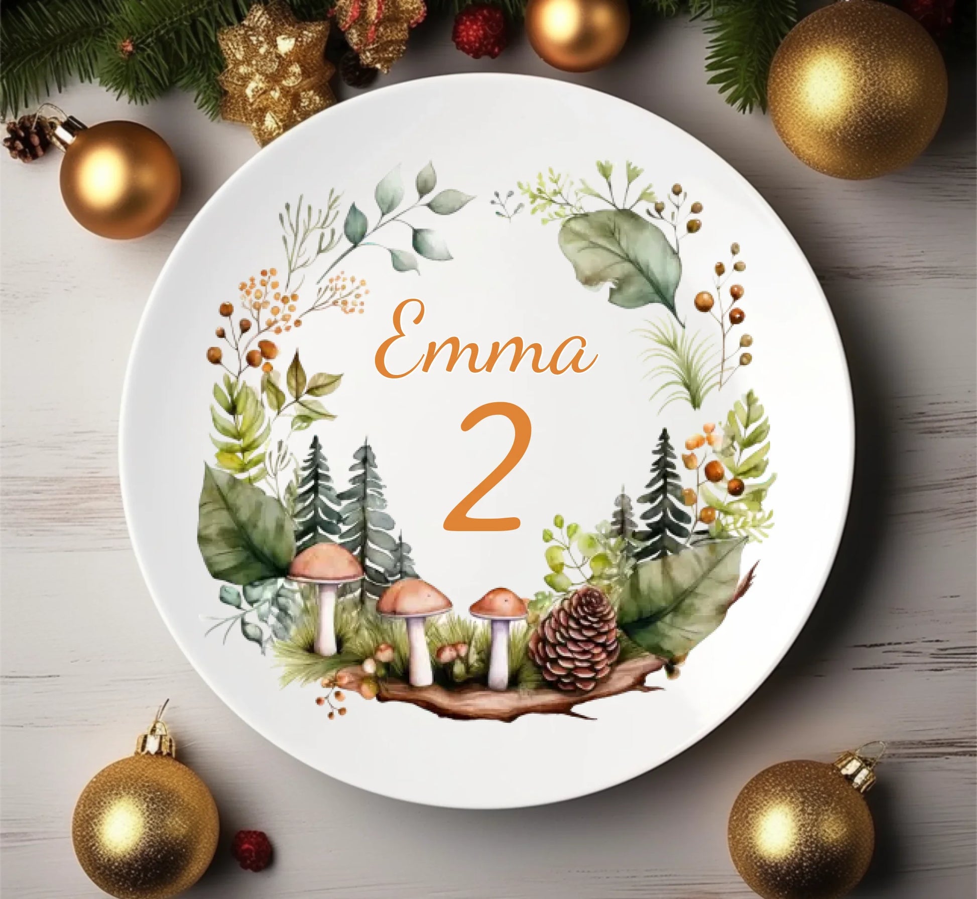 Personalisierter Kinderteller mit Namen, Pflanzen und Waldpilzen Kindergeschirr Teller 1. Geburtstag, Geburtstagsgeschenk, Geschenk Einschulung