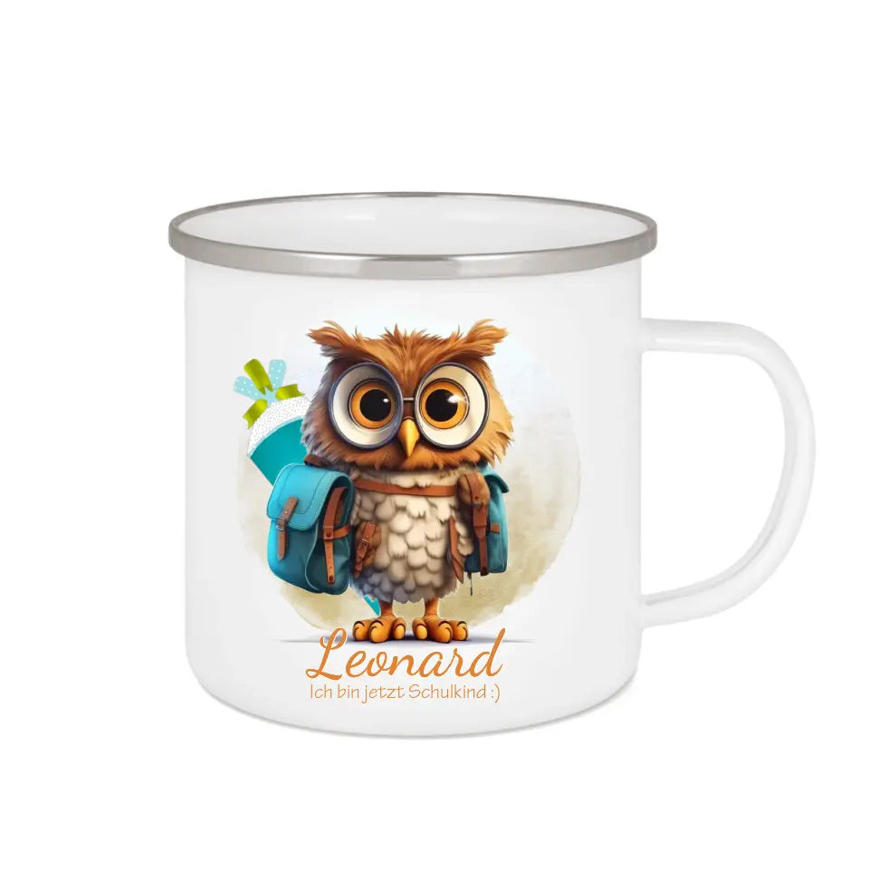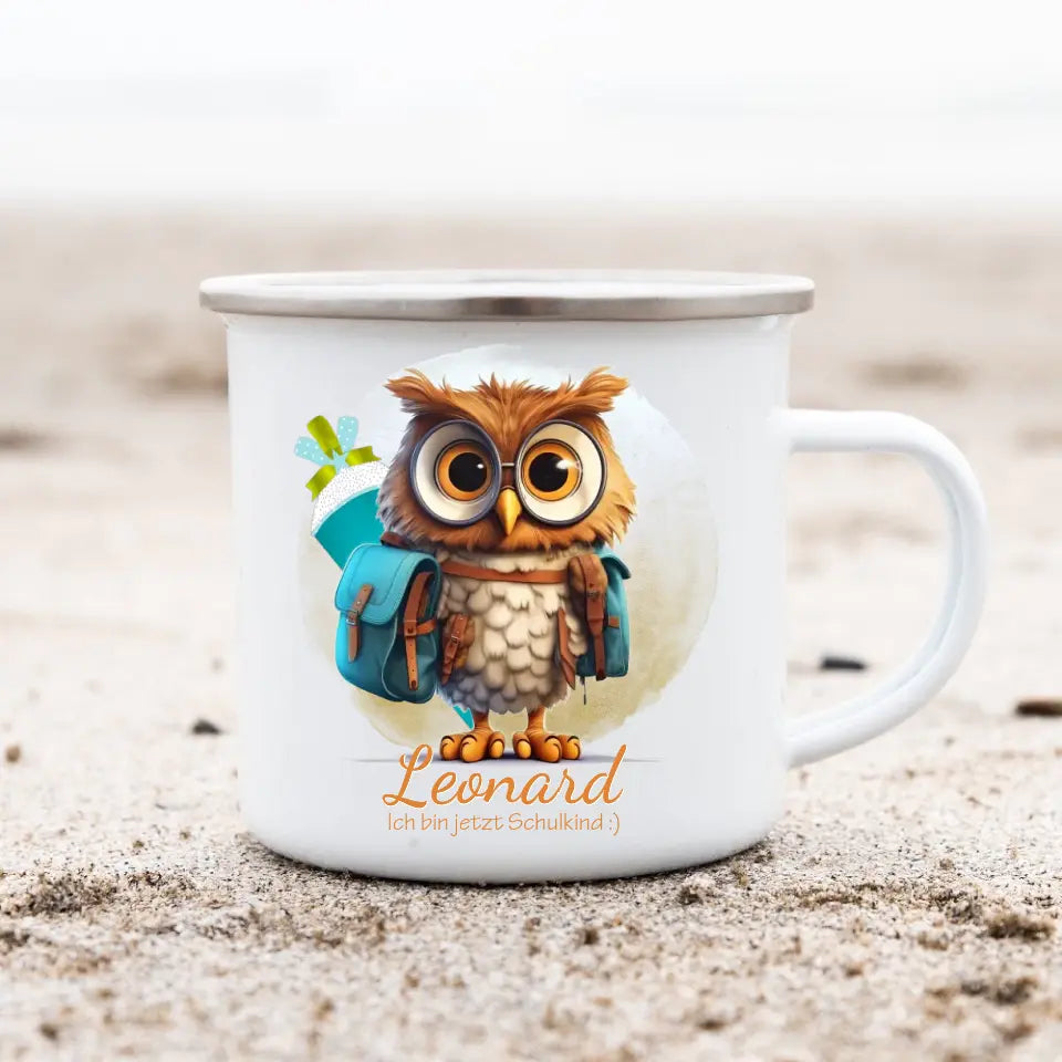 Schulanfang Kindertasse Schulkind 2024 - Emaille Kinderbecher Eule Einschulung mit Namen personalisiert - Einschulungsgeschenk