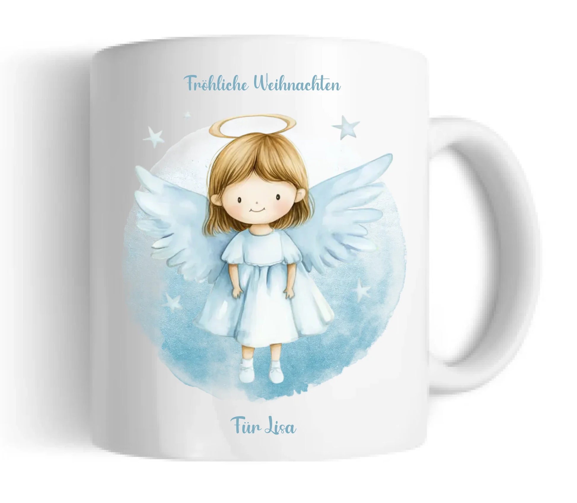 "Weihnachtsengel" Tasse - Personalisierte Tasse mit Schutzengel und Namen für Kinder blau